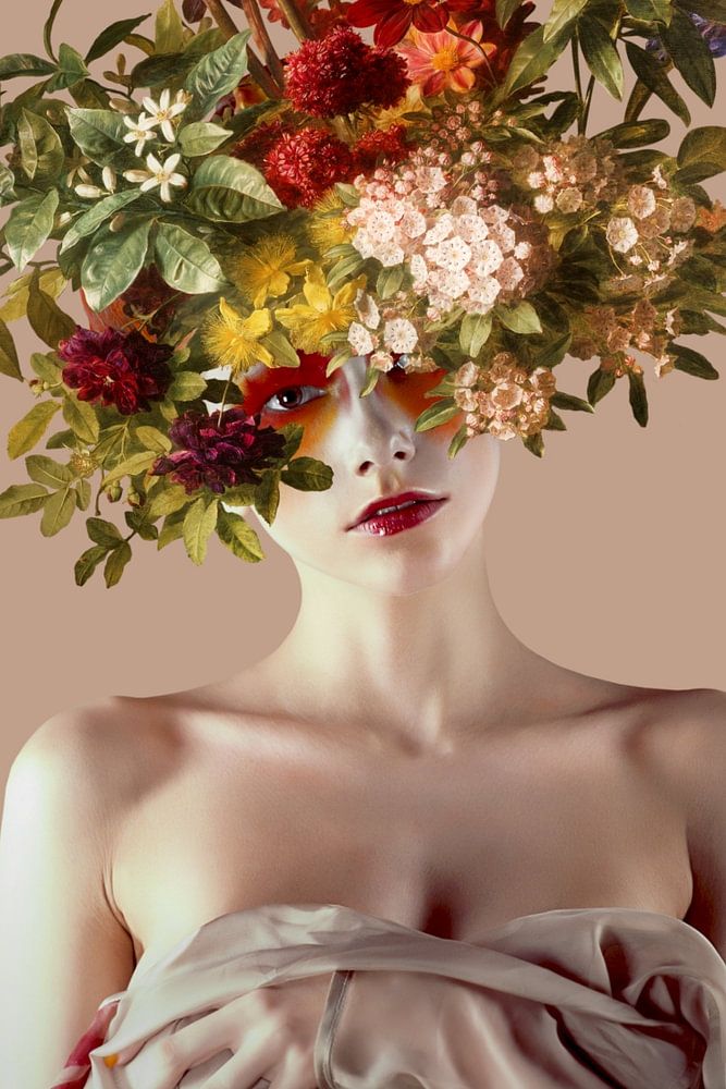 Surrealistisches, herbstliches Porträt einer Frau.