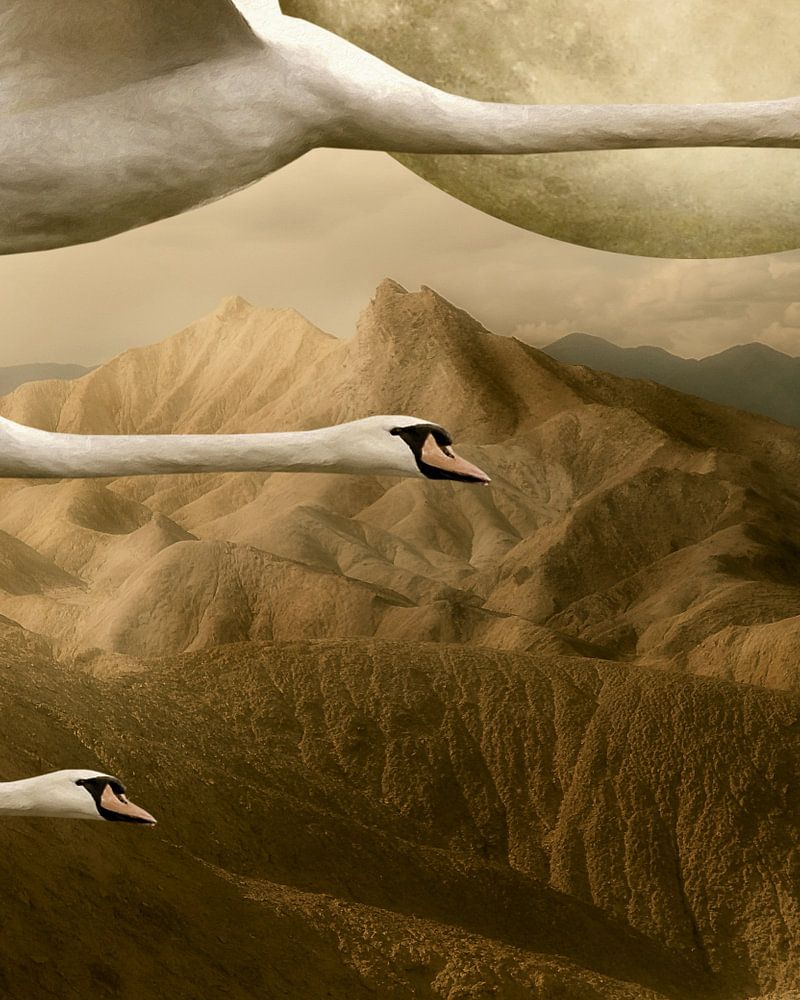 Surrealistisches Porträt von 3 fliegenden Schwänen über der Wiese in einer verträumten Berglandschaft.