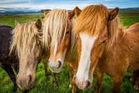 Diese Fotografie zeigt drei Islandponys in direkter Frontalansicht, die den Betrachter mit wacher Neugier und sanfter Gelassenheit ansehen. Ihre charakteristischen Männern, das dichte Fell, und die ausdrucksstarken Augen verleihen jedem Tier eine ganz eigene Persönlichkeit, während sie gleichzeitig als harmonische Einheit wirken. Das…
