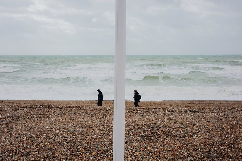 In Brighton, England aufgenommen, zeigt dieses Bild zwei Menschen, die ruhig am Strand entlang spazieren, während im Hintergrund ein stürmisches Meer aufzieht. Eine klare Linie im Bild trennt die beiden Figuren voneinander und wirkt zugleich wie ein Spiegel, der ihre Bewegung und Beziehung zueinander subtil reflektiert.