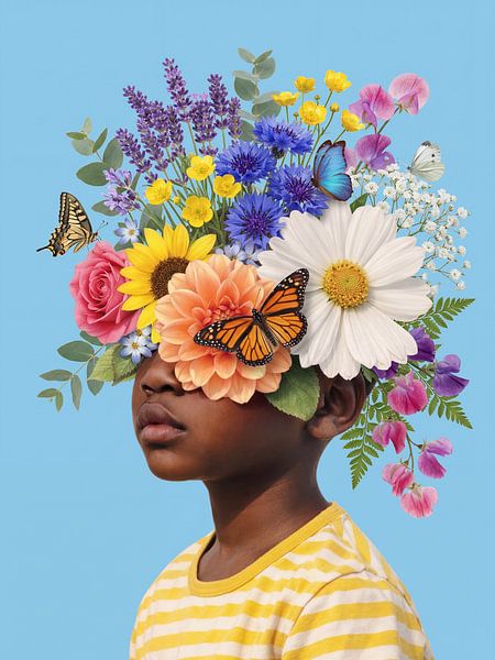 Lassen Sie sich in eine Welt entführen, in der Träume und Natur verschmelzen. Dieses bezaubernde Porträt zeigt ein Kind, dessen Gedanken buchstäblich in einer üppigen Farbexplosion zur Blüte kommen. Eine Komposition aus Sonnenblumen, Dahlien und…