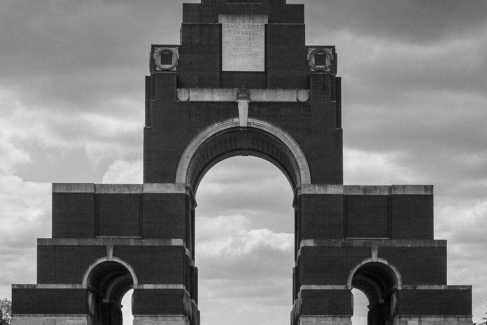 Das Thiepval-Denkmal steht feierlich unter einem düsteren, stimmungsvollen Himmel und ist ein Zeugnis für die Tapferkeit und das Opfer der französischen, britischen und Commonwealth-Soldaten in den Schlachten an der Somme. Die Schwarz-Weiß-Fotografie fängt den starken Kontrast zwischen dem düsteren Denkmal und dem dramatischen Himmel ein und erweckt ein Gefühl der Ehrfurcht und Besinnung. Ein ergreifendes Andenken an Ihren Besuch in Thiepval bei Amiens in Hauts-de-France