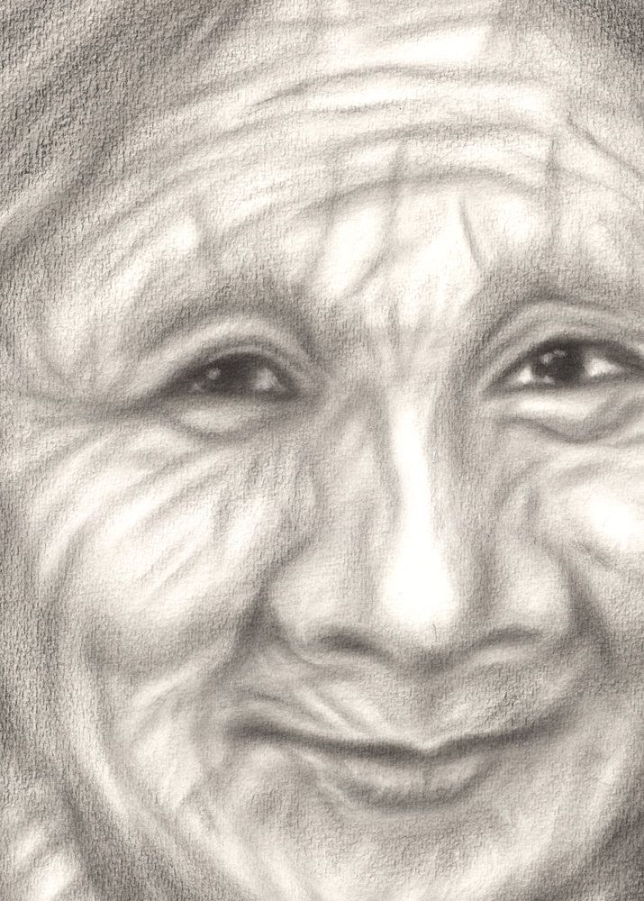 Dieses Bild wurde mit der Drybrush-Technik gemalt. Bei dieser Technik wird ein trockener Pinsel mit ein wenig schwarzer Ölfarbe auf Aquarellpapier verwendet. Das Werk wird in vielen Schichten gemalt und die weißen oder hellen Flächen werden dazwischen wegradiert. Dies ist eine sehr schöne Technik, um Tierfelle darzustellen und Porträts Tiefe zu verleihen.
