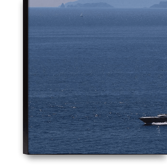 Dieses Werk fängt die ruhige Essenz eines Sommertages an der Costa Brava ein. In der Mitte der Komposition sehen wir ein Motorboot, das elegant über das ruhige, klare blaue Meer fährt und eine weiße Dünung hinter sich lässt. Im Hintergrund erscheint eine bezaubernde Küstenlinie mit sanften Bergen, umgeben vom sanften Blau des Himmels…