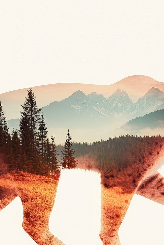 Ein majestätischer Wildkatze mit einer zauberhaften Landschaft aus Bergen und Wäldern im Inneren, der die Harmonie von Natur und Tierwelt in einem einzigen Moment einfängt. Dieses Kunstwerk bringt eine lebendige, entspannte Atmosphäre in jedes Wohnzimmer und lädt zum Träumen von Abenteuern in der Wildnis ein.