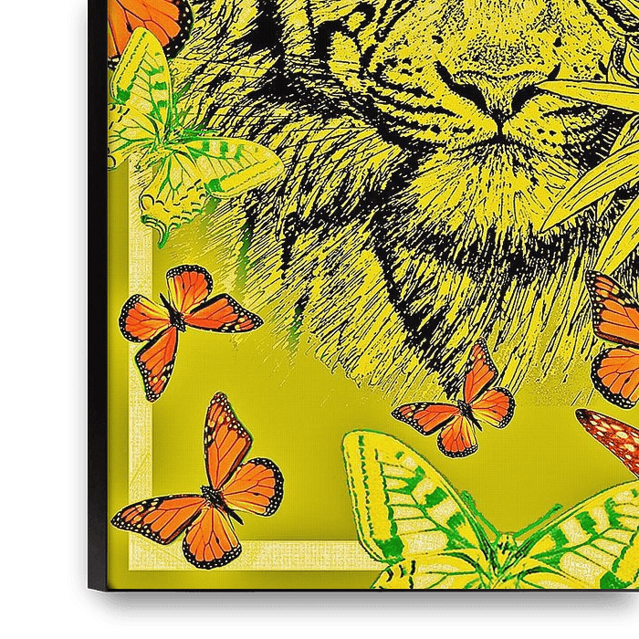 Bestelle dieses Schmetterling-Wandbild Tiger And Butterflies In Olive von GittaGsArt als Reproduktion auf Leinwand, Alu-Dibond, als Poster, Fototapete oder Acrylglasbild.