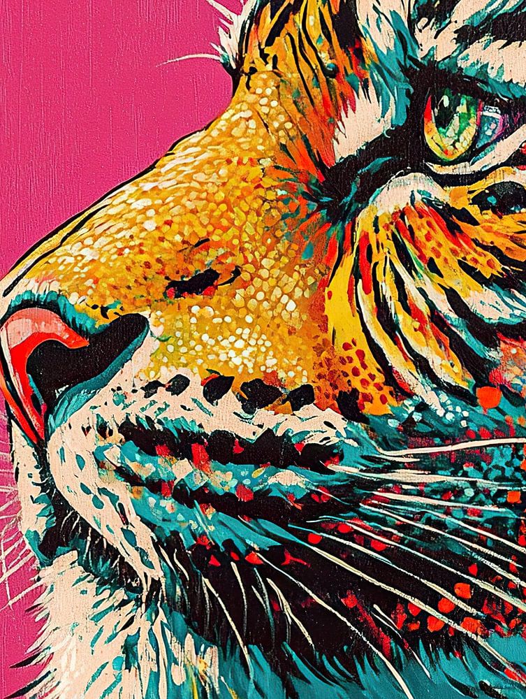 Tiger | Modern Tiger Art - Dieses Gemälde zeigt einen kräftigen Tiger mit leuchtend buntem Fell in Orange, Schwarz und Türkis vor einem strahlend rosafarbenen Hintergrund, was ihm einen modernen und künstlerischen Look verleiht.