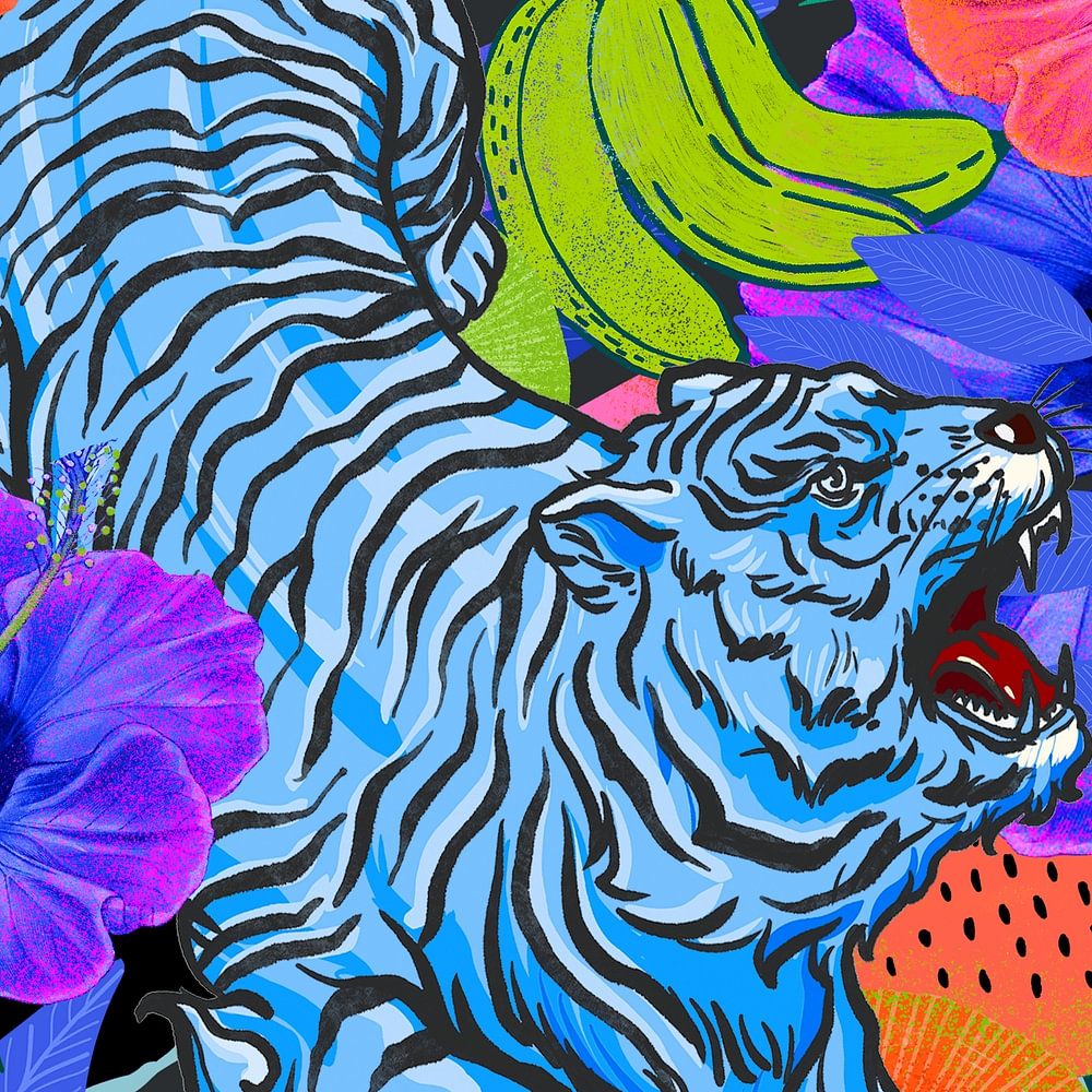Abgebildet sind ein Tiger, Blumen, Früchte und ein Neonrahmen.