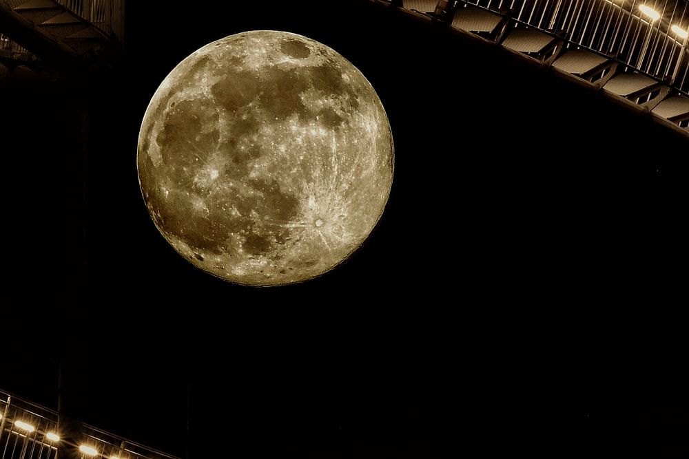 Die Beleuchtung des Stegs und der Vollmond machen das Bild schön.