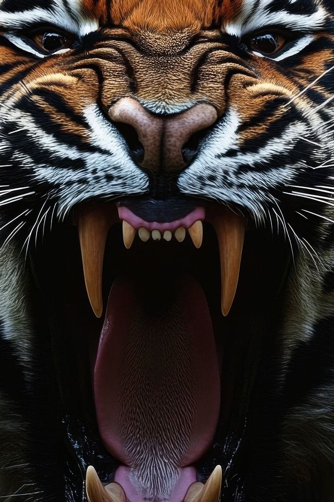 Ein majestätischer Tiger mit offenem Maul strahlt eindringliche Kraft und Wildheit aus. Die leuchtenden orangefarbenen und schwarzen Streifen fangen den Blick und verleihen dem Raum eine spannende Atmosphäre. Perfekt geeignet für das Wohnzimmer, wo er lebendige Gespräche anregen und eine eindrucksvolle Fokussierung bieten kann.