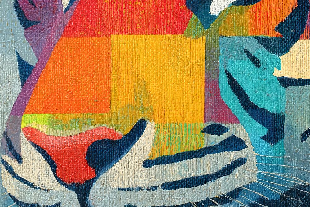 Tiger - Dieses Tierbild zeigt einen farbenfrohen Tiger mit großen, leuchtenden Augen, wobei die Standflächen in verschiedenen Schattierungen und Farben in einem abstrakten Stil wiedergegeben sind.