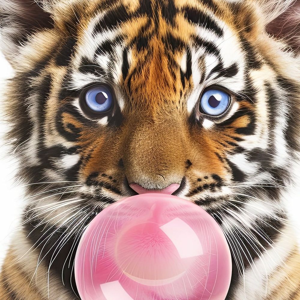Dieses bezaubernde Kunstwerk zeigt ein süßes Tigerbaby, das eine große, rosafarbene Kaugummiblase macht. Die strahlend blauen Augen und der verspielte Ausdruck des Tigerjungen verleihen dem Bild einen unwiderstehlichen Charme. Perfekt für Kinderzimmer oder als humorvoller Akzent in modernen Wohnräumen, bringt dieses Bild Freude und Lebendigkeit in jedes Zuhause.