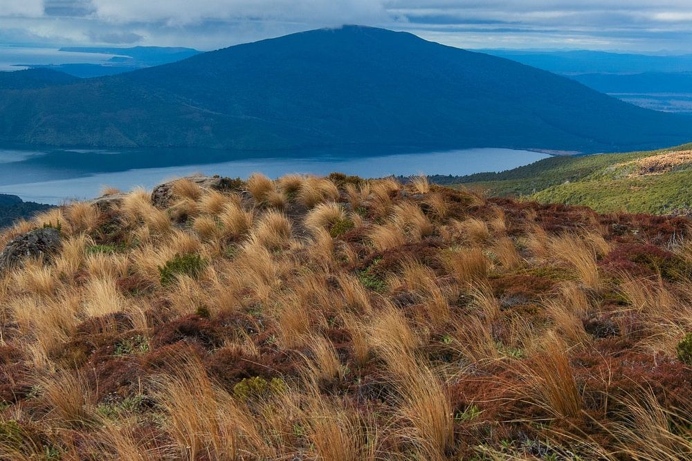 Blick vom Tongariro NP in Richtung Taupo, Neuseeland.