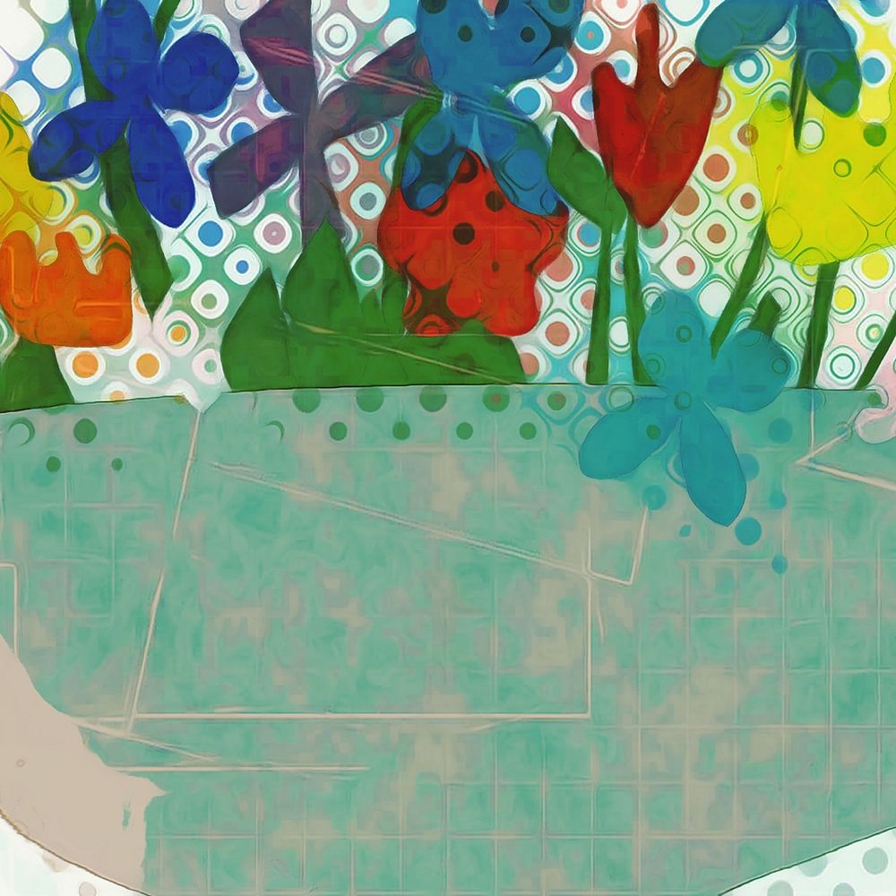 Ein Stillleben mit einer Vase oder einem Topf voller bunter Blumen. Handgezeichnet und später mit Aquarell und Pastell bearbeitet.
