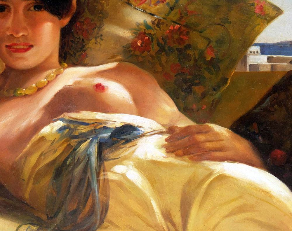 Dieses Mädchen liegt mit einem Lächeln oben ohne gegen ein Kissen mit der Skyline der Hauptstadt Algeriens und dem Mittelmeer im Hintergrund. Die Dame mit der Blume im Haar hat ihren gelben Anzug halb aufgeknöpft, so dass beide Brüste sofort auf das Porträt gelegt werden.