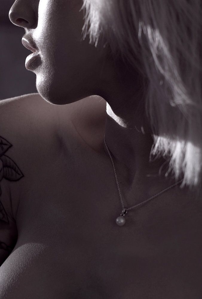 Frau, deren Brüste in spärlichem Licht beleuchtet sind. Das sexy Mädchen ist nackt und das Licht zeigt ein sinnliches Bild mit Reflexionen auf ihrer rechten Schulter und Brust. Das Modell ist nackt und strahlt Sinnlichkeit und Erotik aus.