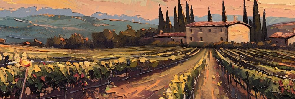 Dieses Werk zeigt einen toskanischen Weinberg in der frühen Morgensonne. Reihen von Weinstöcken erstrecken sich über die sanften Hügel, mit einem Landhaus und Zypressen im Hintergrund. Der Himmel ist in sanfte Rosa- und Orangetöne getaucht, die eine warme und friedliche Atmosphäre schaffen. Der Weinberg und die umliegende Landschaft spiegeln die natürliche Schönheit und Ruhe der toskanischen Landschaft wider und sind ein perfektes Abbild der heiteren italienischen Landschaften.