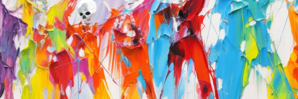 Digitales Gemälde von bunten tanzenden Skeletten.