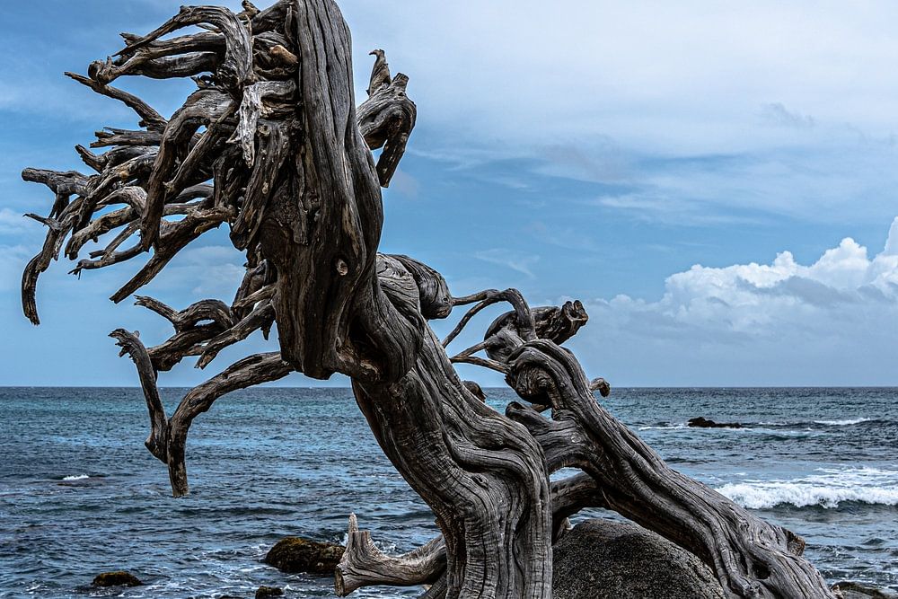 Die Ostküste Arubas ist zerklüftet und besteht hauptsächlich aus Felsen und kleinen Stränden. Wie ist dieser tote Baum hierher gekommen?