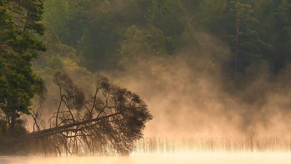 Nebels über einem See in Schweden. Toter Baum, der im Morgengrauen ins Wasser ragt. Skandinavische Natur