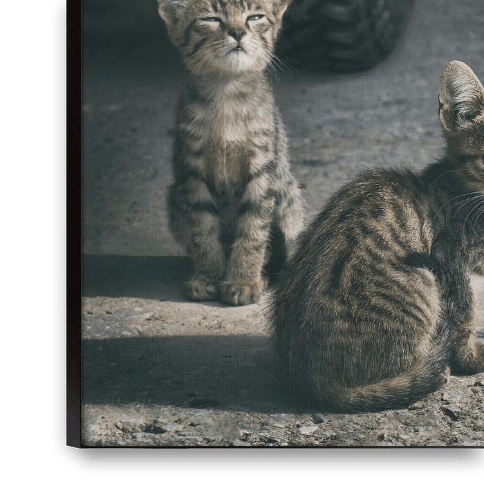 Entdecken Sie das charmante Bild zweier frecher, taffer Kätzchen, die stolz nebeneinander vor einer Autostoßstange stehen. Mit ihrem glänzenden Fell und ihren funkelnden Augen strahlen diese Kätzchen Entschlossenheit und Charakter aus. Das eine Kätzchen blickt selbstbewusst in die Linse, während das andere ein verschmitztes Funkeln in…