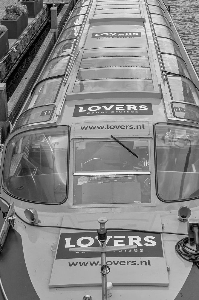 Vor dem Hauptbahnhof in Amsterdam warten Kanalboote geduldig auf die Touristen. Dieses Werk ist auch in Farbe erhältlich.