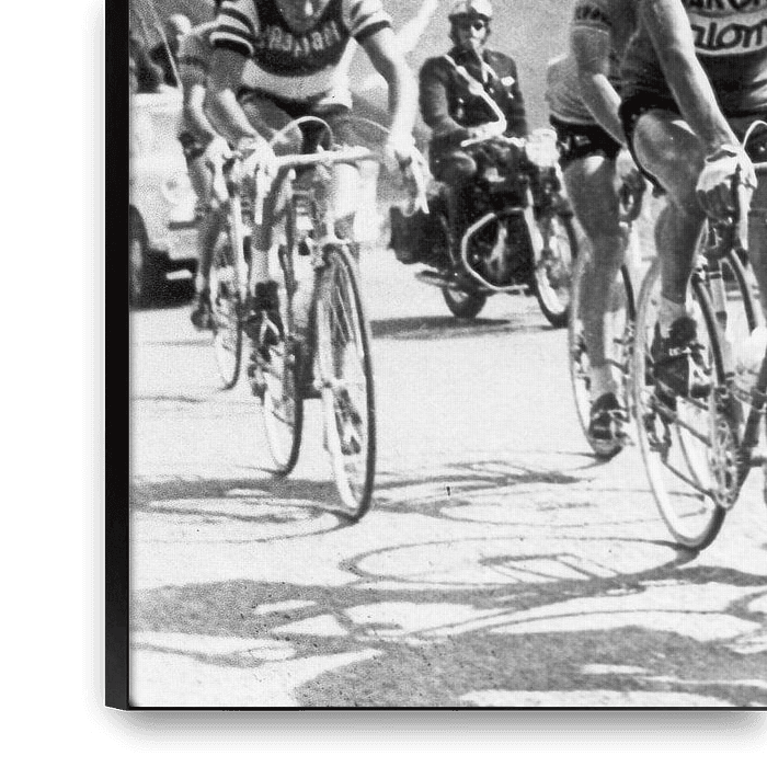 Auf dem Foto Radfahrer Jacques Anquetil, Federico Bahamontes und Raymond Poulidor am Col du Tourmalet