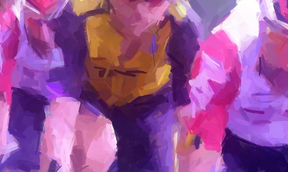 Expressionismus. Gemalt in der Art des abstrakten Expressionismus. Geschwindigkeit von Radfahrern durch Malerei wiedergegeben. Auf Leinwand mit Acrylfarbe, das Bild des Gemäldes ist leicht digital manipuliert. Moderne Kunst. Zeitgenössische Kunst.