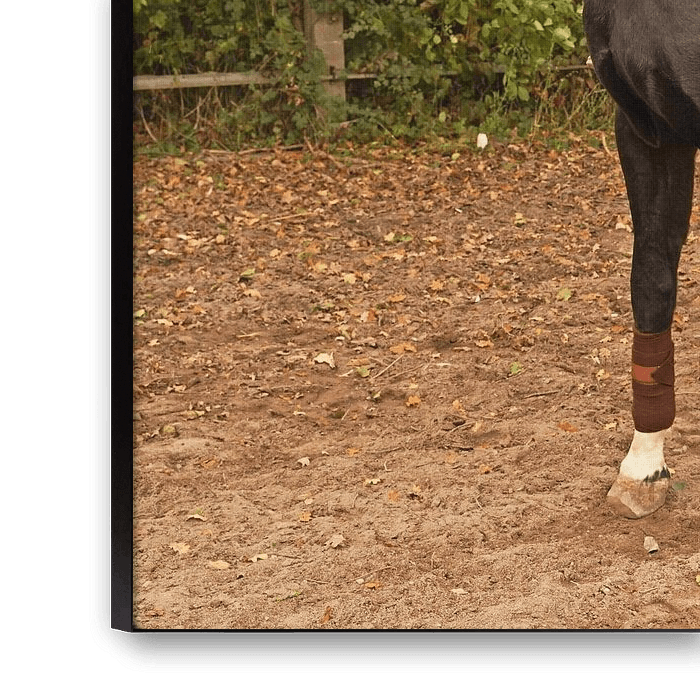 Bestelle das Foto Training mit dem Bayer Rappen Baveria auf einem Reitplatz im Herbst von Babetts Bildergalerie als Reproduktion auf Leinwand, Alu-Dibond, als Poster, Fototapete oder Acrylglasbild.