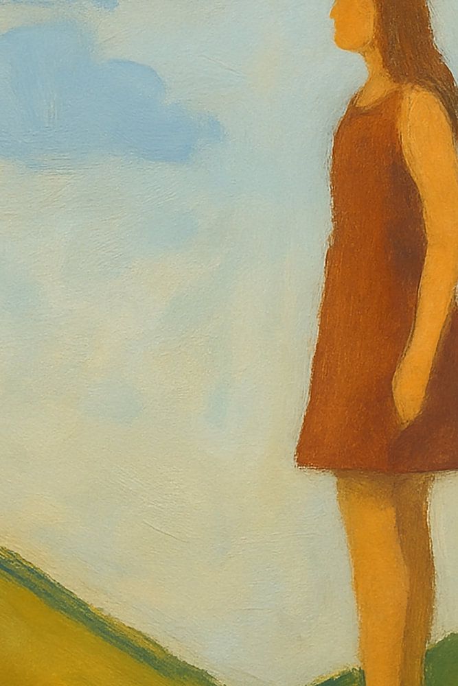 Ein stiller Moment auf einem abstrakten Berggipfel. Die Frau in warmen Tönen blickt verträumt über den Horizont, umgeben von Wolken und sanft geschwungenen Hügeln. Perfekt für einen ruhigen, modernen Wohnstil mit einem Hauch von Poesie.