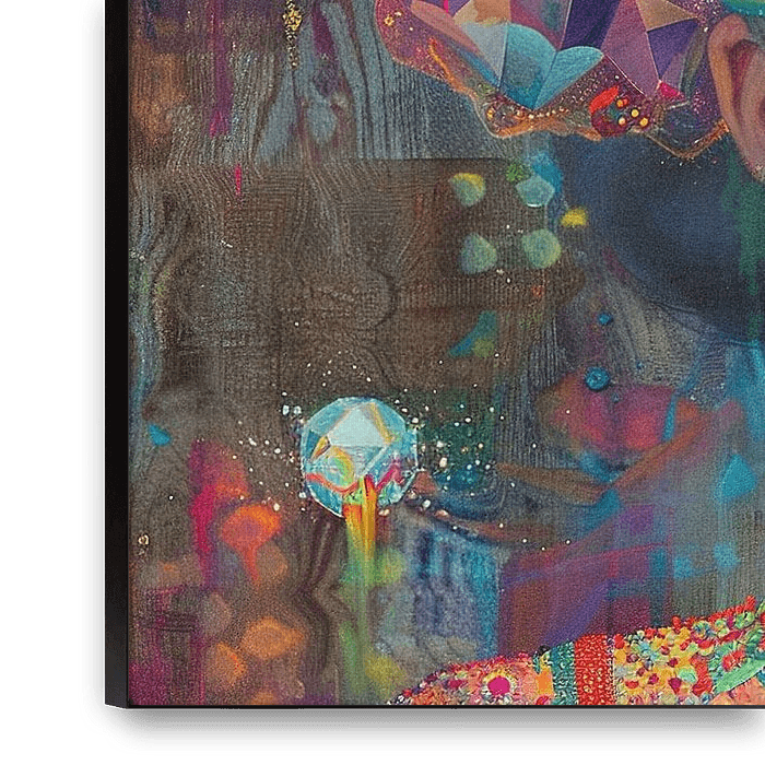 Dreamscape | Ethereal Visionscape - Dieses surreale Gemälde zeigt das Gesicht einer Frau mit geschlossenen Augen, umgeben von bunten, geometrischen Formen und einer wasserähnlichen Textur auf ihrer Haut, die eine träumerische Atmosphäre schafft.