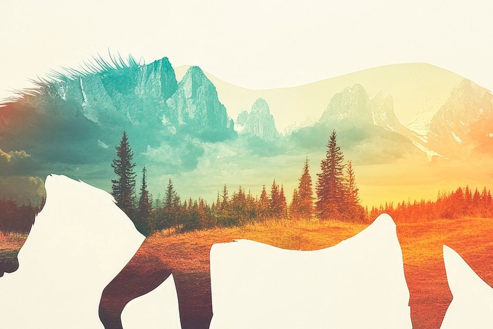 In sanften, harmonischen Farben vereint sich die Silhouette eines majestätischen Tieres mit einer traumhaften Landschaft aus Bergen und Wäldern. Diese kreative Darstellung entfaltet ihren Charme besonders in einem Wohnzimmer oder Flur, wo sie Gespräche anregt und eine ruhige, inspirierende Atmosphäre schafft. Ideal für Naturliebhaber und kreative Seelen!