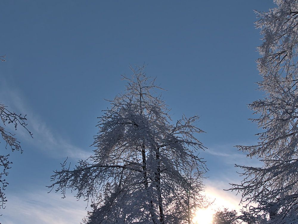 Traumhafte Winterlandschaft am Hang des Kornbühls bei Salmendingen auf der Schwäbischen Alb mit schneebedeckten Bäumen, deren Zweige gefroren sind, im Gegenlicht.