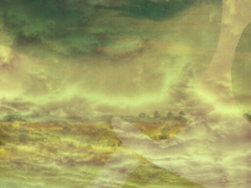 Dies ist eine Photomontage einer gezeichneten Frau und einer digital veränderten Landschaft