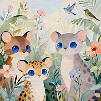 Begeistern Sie Ihr Kind mit diesem bezaubernden Aquarellbild aus der Kollektion „The Dreamling Meadow – Kids Collection“. Dieses luxuriöse Kunstgemälde in Museumsqualität zeigt drei entzückende, stilisierte Tierfiguren mit großen, ausdrucksstarken blauen Augen, die sich in einem üppigen, lebendigen Dschungel aneinander schmiegen. Die…