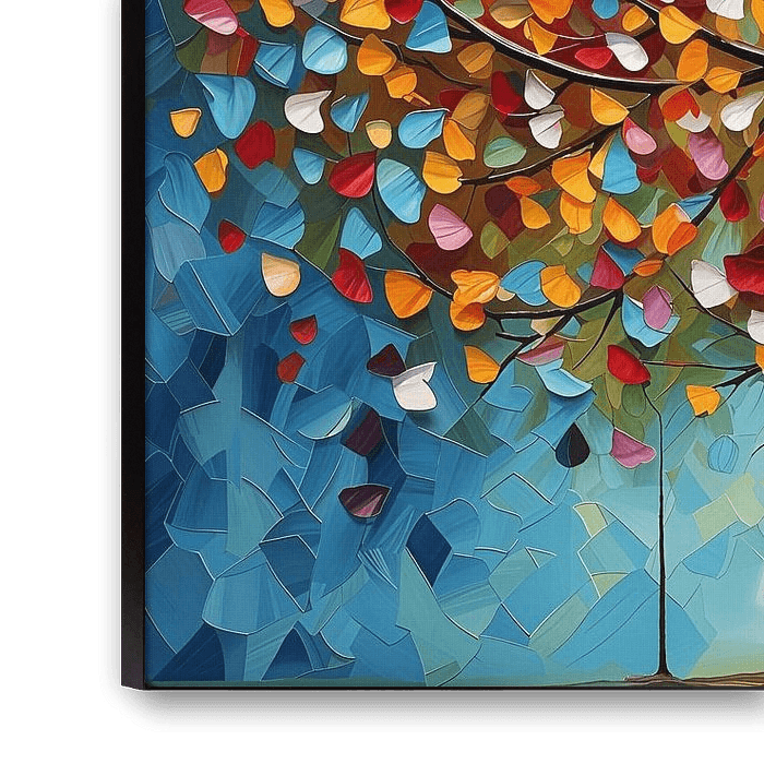 Ein fiktives Gemälde eines Baumes mit bunten Blättern vor blauem Hintergrund im Stil einer Kinderbuchillustration.