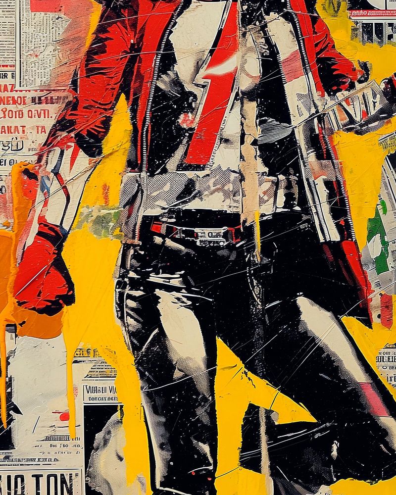 Ein faszinierendes Porträt in Mischtechnik, bei dem Sanftheit auf städtische Kanten trifft. Die Frau in diesem Werk schaut verträumt in die Ferne, als würde sie zwischen Realität und Fantasie schweben. Um ihren Kopf herum entfaltet sich eine Collage aus grafischen Elementen, Typografie, Farbtexturen und Farbakzenten, die eine visuelle Erzählung bilden - persönlich, vielschichtig und kraftvoll.