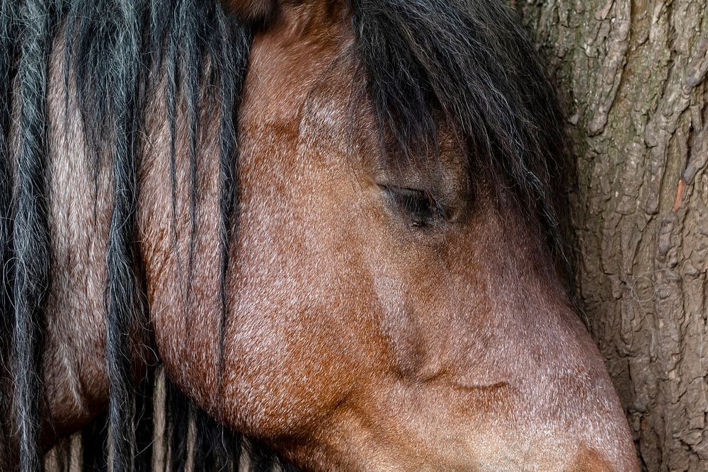 Traurig lehnt die Kaltblüterstute am Baum. Sie ist nicht gerne alleine auf der Weide
