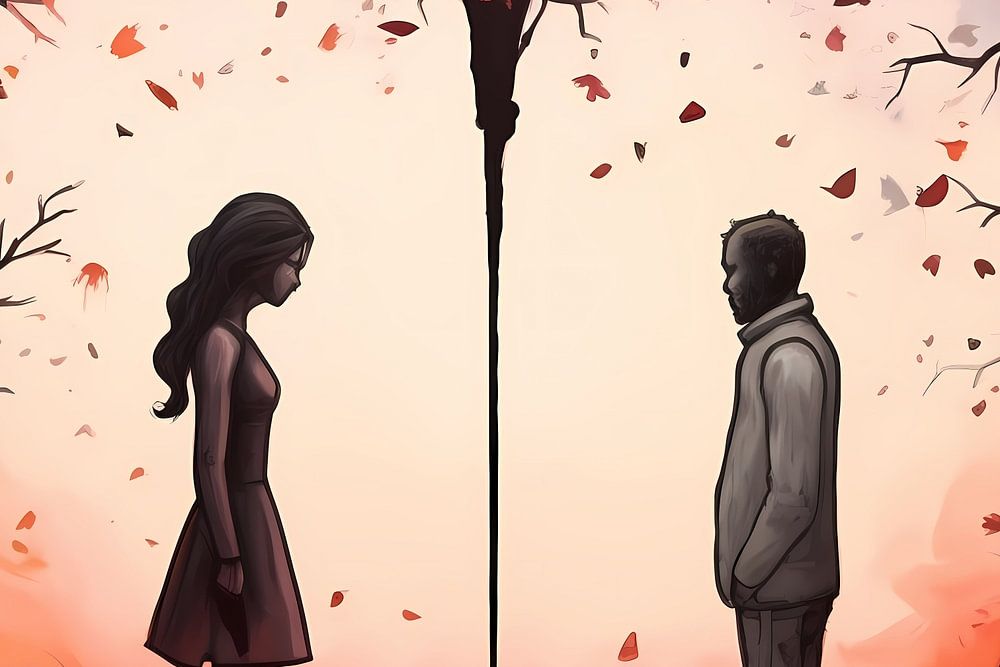 Dieses Design stellt ein tiefes Gefühl dar, das den Kern der menschlichen Erfahrung trifft: den Liebeskummer. Es zeigt einen Mann und eine Frau, die durch einen von oben nach unten verlaufenden Riss getrennt sind, der eine Herzform zwischen ihnen bildet. Die Szenerie ist dramatisch, mit einem Hintergrund, der von warmen orange-roten Tönen zu kühlen Grautönen übergeht und die Komplementarität und Kontraste romantischer Beziehungen darstellt. Man hat den Eindruck, dass sich das Paar in das Netz seiner Gefühle verstrickt hat, das durch die in der Luft schwebenden Blätter dargestellt wird. Dieses Werk wäre eine beeindruckende Bereicherung für jeden Raum, ein Gesprächsstoff, der ebenso viel über Kunst wie über das Leben selbst aussagt.