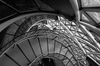 Die Treppe im Rathaus von London dreht sich nach unten. Das Linienspiel zwischen der Treppe und dem Außenbereich spielt mit der Perspektive.