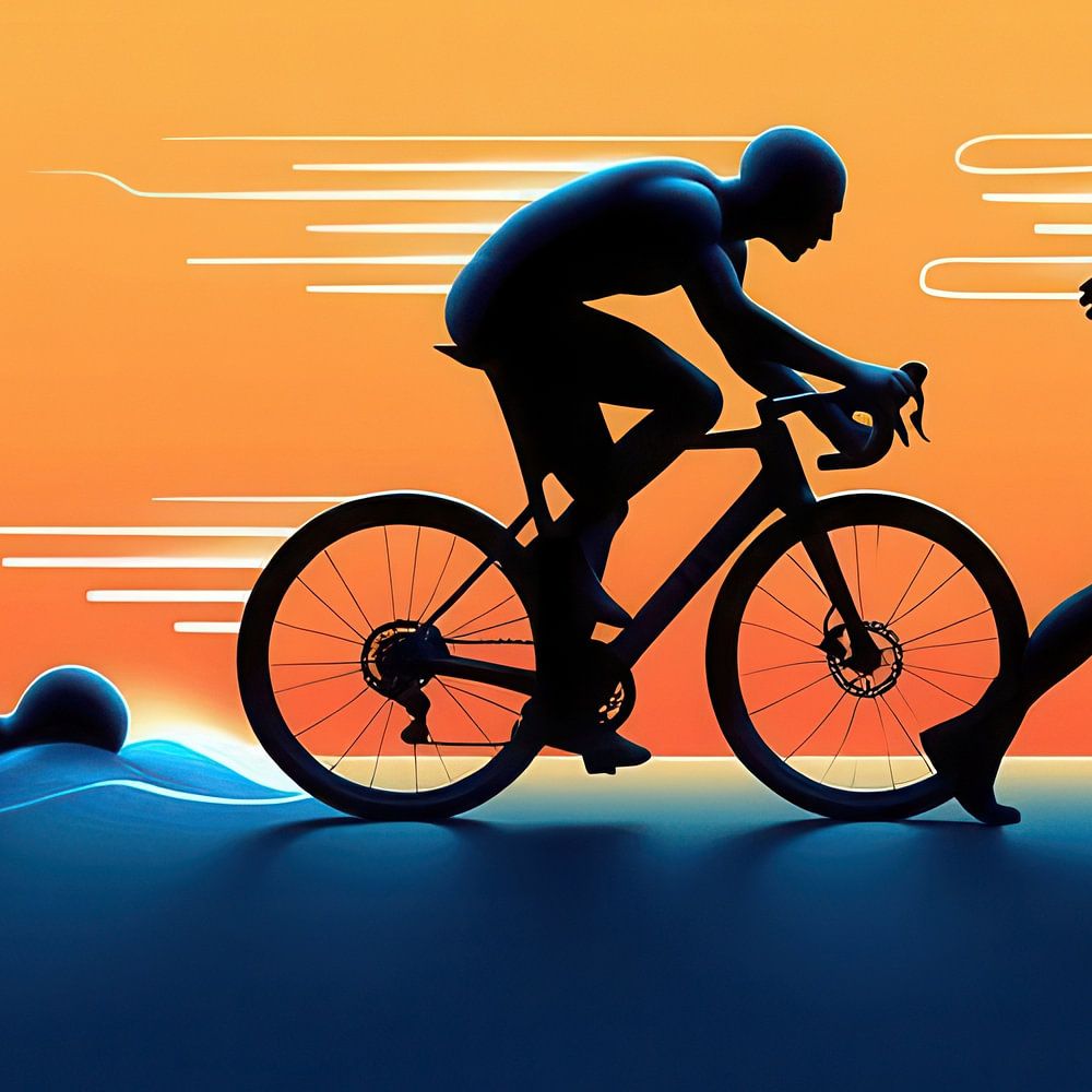 In diesem stilisierten Kunstwerk sind die drei klassischen Bestandteile eines Triathlons - Schwimmen, Radfahren und Laufen - in kraftvollen Silhouetten vor einem warmen orangefarbenen Sonnenuntergang dargestellt. Die fließenden Übergänge und klaren Linien symbolisieren Geschwindigkeit, Rhythmus und Ausdauer.