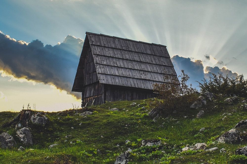 Zajamniki, Triglav-Gebirge in Slowenien, Hütte, Sonnenlicht, Sonnenuntergang