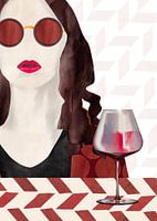 Eine grafische Darstellung einer Frau mit Sonnenbrille, gepunkteter Bluse, langen Haaren und einem Glas Rotwein. Ein Tisch und Hintergrund mit grafischem Muster.
