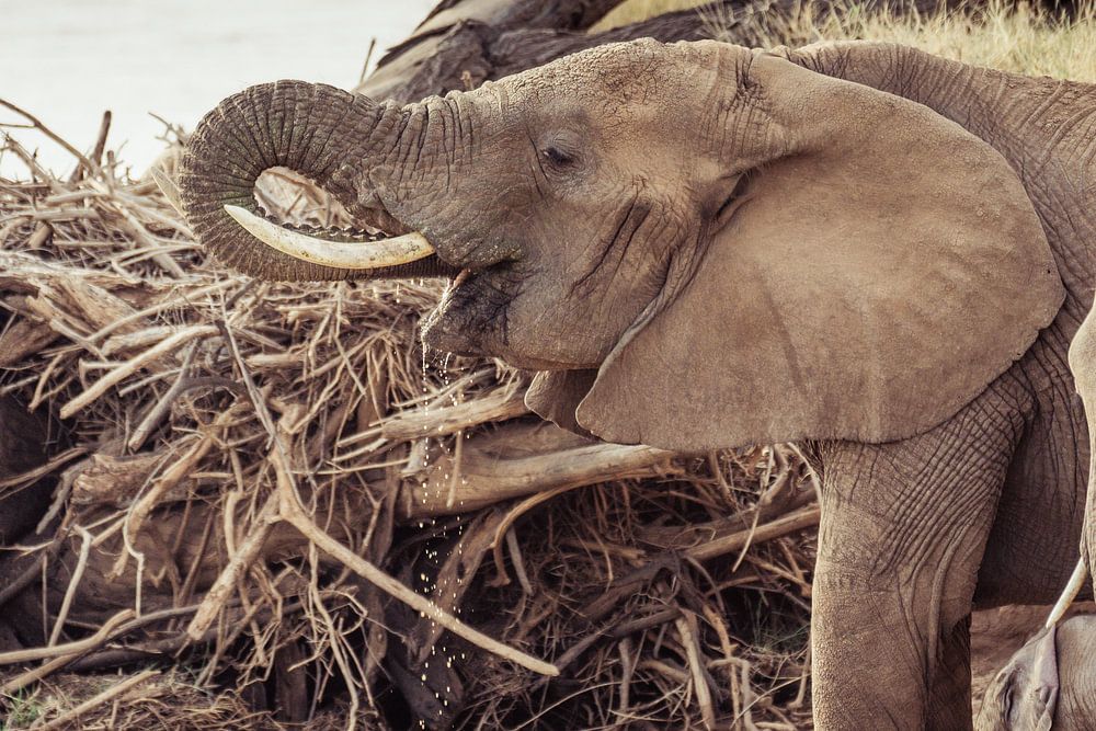 Eine Gruppe von Elefanten, darunter Mutter und Jungtiere, trinken an einem Fluss im Samburu-Nationalpark, Kenia. Das Jungtier ist weniger als einen Monat alt.