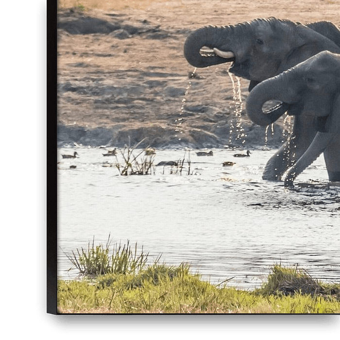 Bestelle das Foto Trinkende Elefanten im Hwange NP, Simbabwe von Paul de Roos als Reproduktion auf Leinwand, Alu-Dibond, als Poster, Fototapete oder Acrylglasbild.