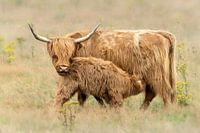 Naturschutzgebiet Veluwezoom an der Veluwe in den Niederlanden. Ein milchtrinkendes Kalb mit seiner Mutter, einer schottischen Highlanderin, grast in der Heidelandschaft des Veluwezoom.