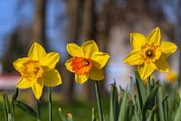 Drei strahlende Narzissen recken ihre leuchtend gelben Blütenblätter der warmen Frühlingssonne entgegen, wobei die mittlere Blume mit einer kräftig orangefarbenen Nebenkrone einen besonders lebhaften Farbakzent setzt. Der sanft verschwommene Hintergrund lässt die tiefblauen Farbtupfer des Himmels und das zarte Grün der Wiesen harmonisch…