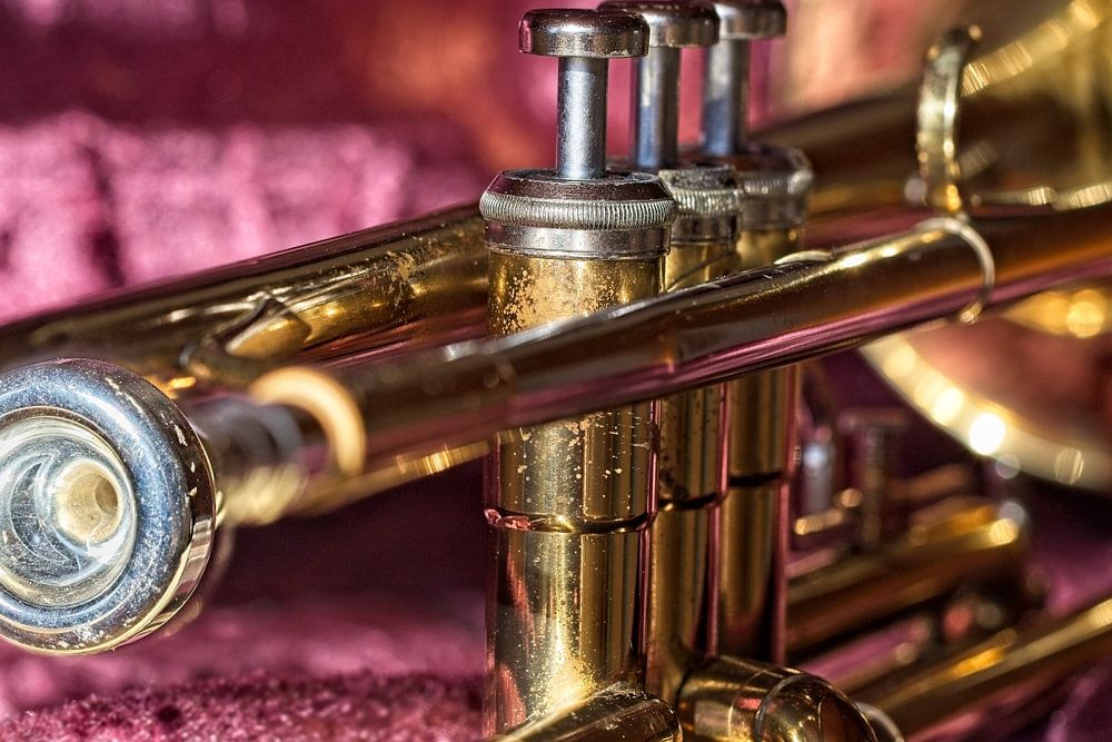Die Trompete ist ein Blechblasinstrument mit 3 Ventilen, wie es in einem Blasorchester verwendet wird. Hier eine Nahaufnahme mit Schwerpunkt auf dem Mundstück und den Ventilen (Focus Stacking), wobei der Rest des Instruments in ein schönes Bokeh übergeht. Focus Stacking ist eine Technik, bei der mehrere Fotos mit unterschiedlichen Fokuspunkten übereinander gelegt werden.