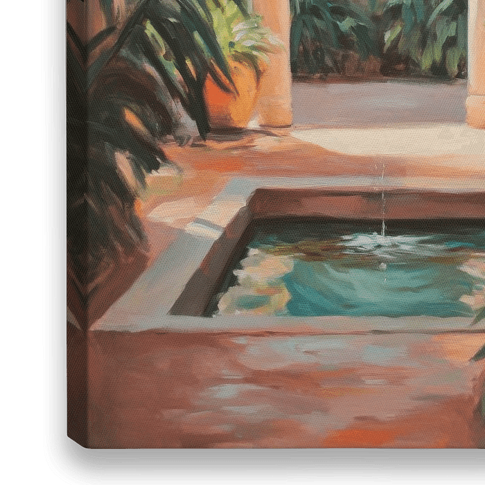 Betörende Grüns und sanfte Erdtöne laden in diese Oase der Ruhe ein. Hochaufragende Palmen umarmen einen stillen Wasserbecken, während das sanfte Licht einer hängenden Laterne den Raum in warmes Glühen taucht. Eine harmonische Verbindung von Natur und Architektur, die zum Verweilen und Träumen anregt.