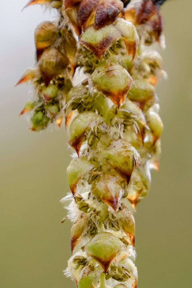 Blütenknospen an einem Zweig, der an einem Ast hängt. An der Unterseite der Blütenknospen ist ein kleiner Tropfen zu sehen. Entstanden durch Nieselregen im Frühling.